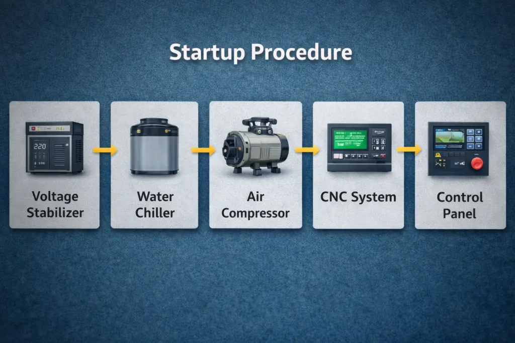 Correct startup prevents system errors, protects components, and ensures accurate axis positioning. Q2: How often should laser gas be replaced?, Laser gas should be replaced every 72 hours or immediately when the alarm appears.